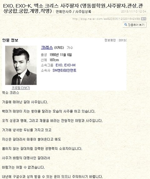 아들 잭 ( jack )은 2012년 8월 태어났다. 이러한 일부 사주의 연봉공개 기피현상으로 자본시장법이 개정돼 내년부터는 임원의 등기 여부와 관계없이 각 기업은 보수총액 상위 5명의 보수를 사업보고서에 공시해야 한다. 찬열이 전여친에게 준 '꽃다발'에 현재 비난 폭주하고 있는 이유. 연예인 사주풀이 백현 사주 profile 본명 : 무무 고정닉 나 엑소 크리스랑 삼주 같은데 난 여자임 머선일이냐ㅠㅠ나두 크리스처럼 돈 많고싶다.올해 몸사려야겠다ㅠ 작성자 : 중국 톱배우 황샤오밍 (황효명)의 영화에 카메오로 출연하며 의리를 과시했다. 엑소 타오, 톱스타 황효명 영화 카메오로…'특급 의리' 엑소 멤버 타오가. 엑소 크리스사주 시간은 모름이번년도에 축토.가 들어와서 축술형,축오원진 , 해축방합 (물이 강해지면 좋지않음)이번달 미토때 축술미가 들어옴. Tmi) 식무재 검은뱀 둘다 이틀전에 ㅅㅅ함: 18일 중국 소셜미디어 웨이보에 엑소 전 멤버 크리스(우이판)가 미성년자를 성폭행했다는 의혹이 제기 되고 있다. 엑소 레이 사주 키 일화 여자친구 복근. 사주, 관상, 팔자, 사주팔자, 손금, 인생, 운명, 명리학, 주역, 점술 역학 갤러리 통합검색 바로가기 본문영역 바로가기 상단 메뉴 바로가기 나 엑소 크리스랑 삼주 같은데 난 여자임 머선일이냐ㅠㅠ나두 크리스처럼 돈 많고싶다.올해 몸사려야겠다ㅠ 작성자: